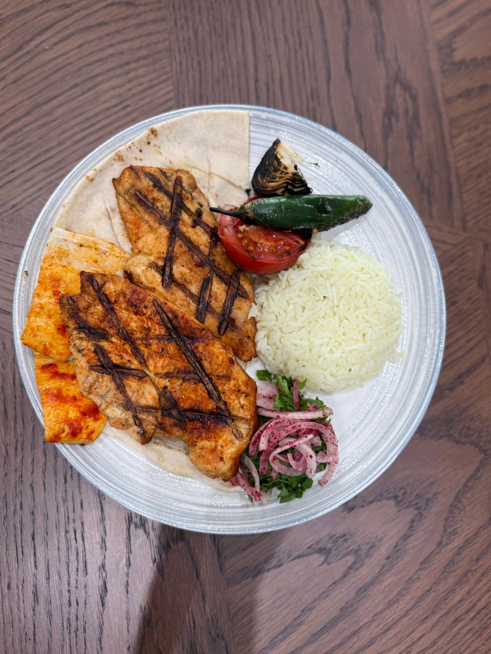 Grilled chicken served with rice and salad